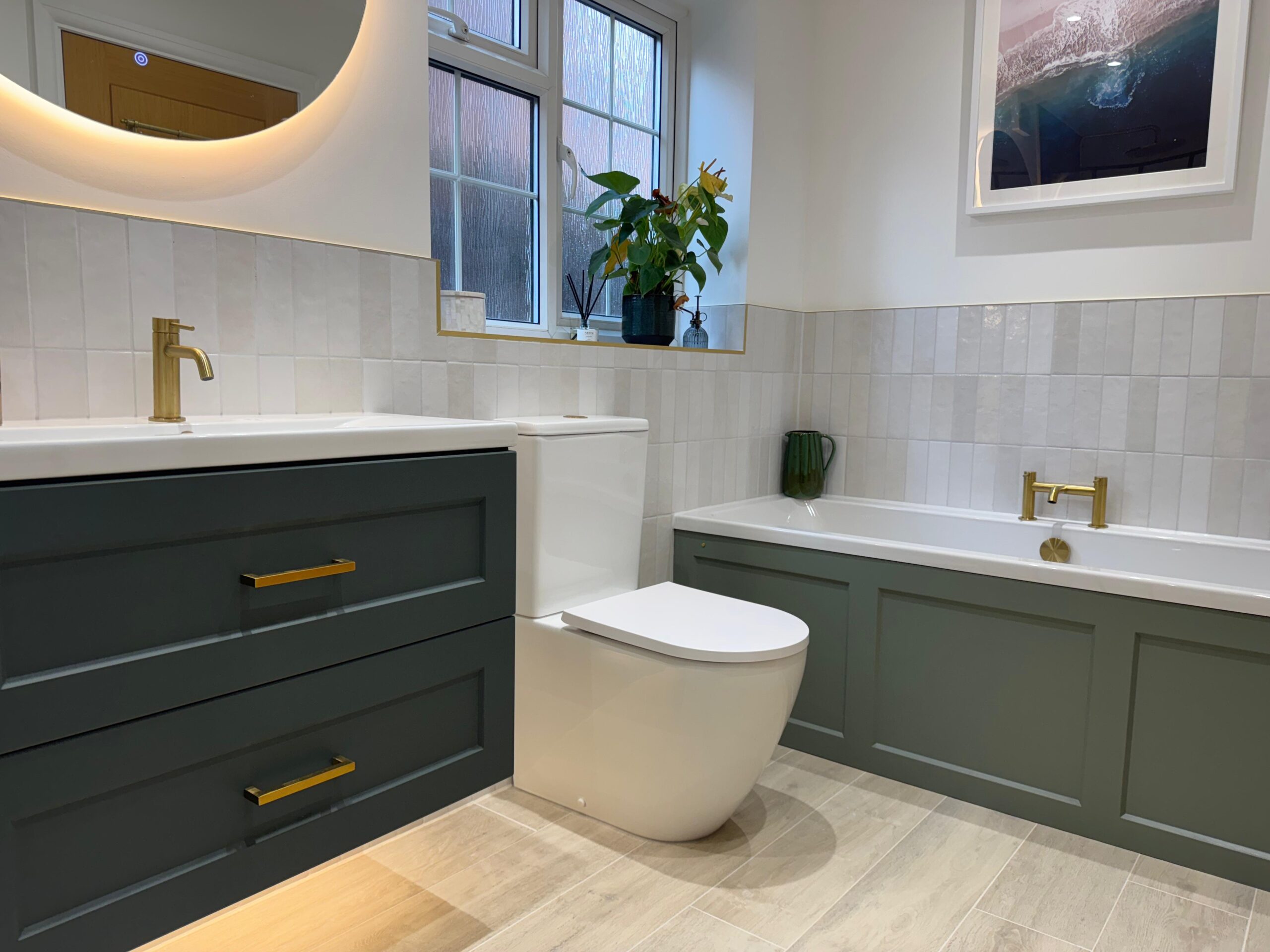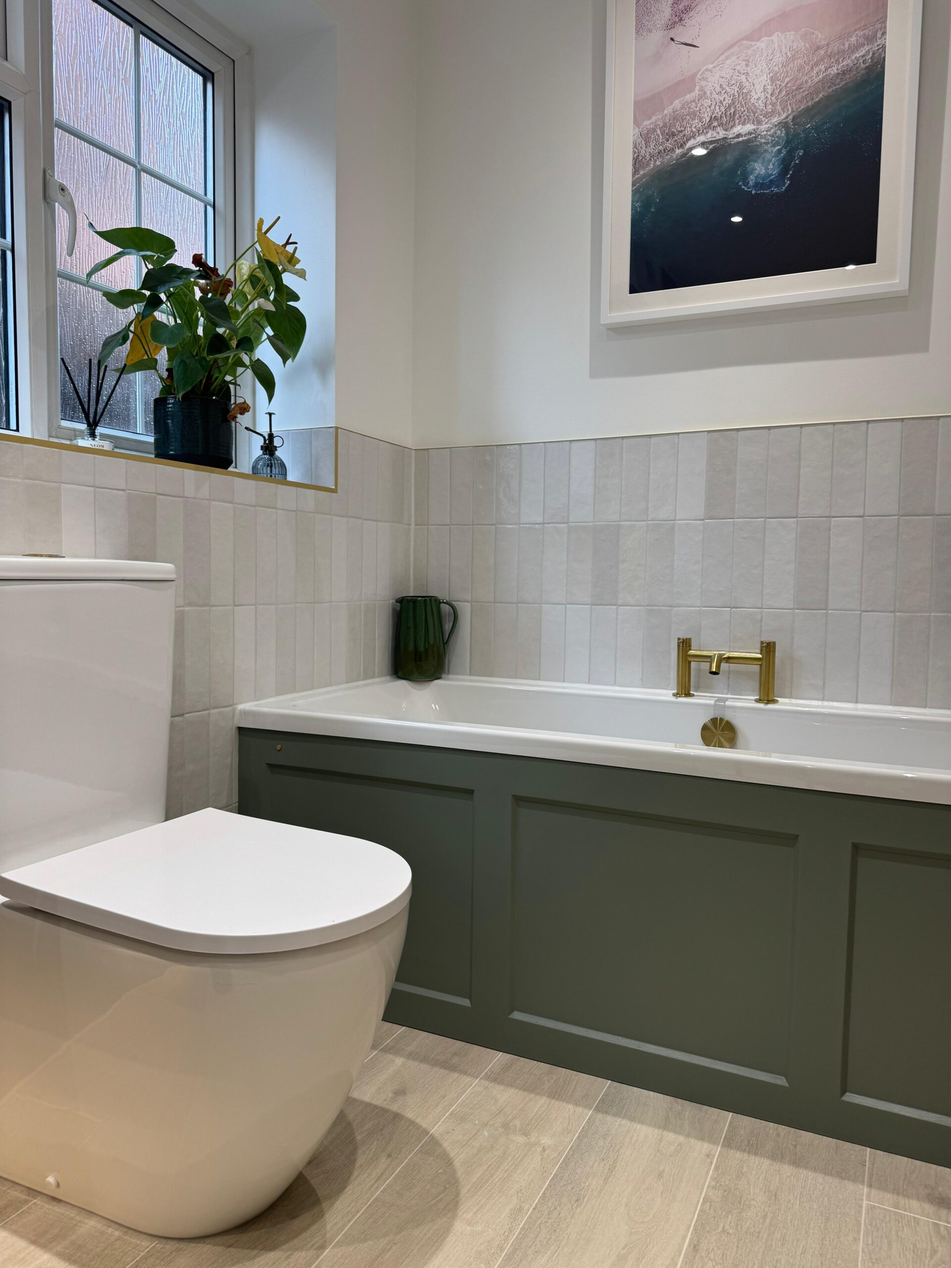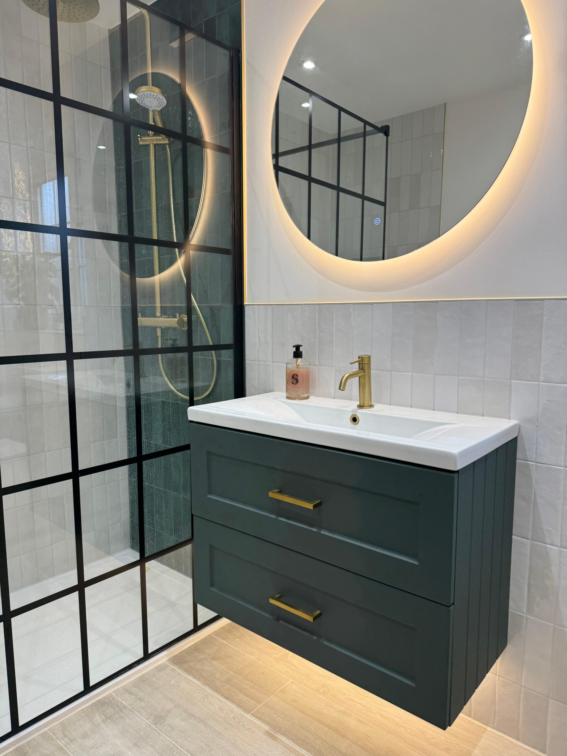 The bathroom features a bespoke walk-in shower enclosure, complemented by a wall-to-wall niche with integrated LED lighting for both style and practicality. Brushed brass fittings add warmth and elegance, while Ca’ Pierre floor tiles paired with matte-finished walls and ceiling create a cohesive, refined finish.